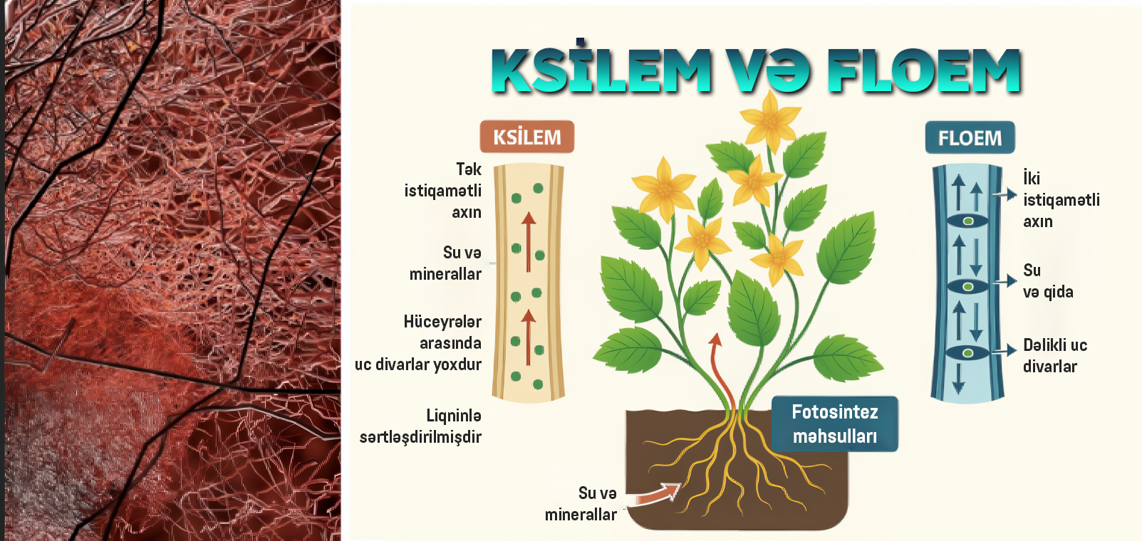 · Ksilema → Kökdən yarpaqlara SU VƏ MİNERAL daşıyır (Aşağıdan yuxarıya).