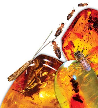Unten links: Eine Köcherfliege in Bernstein, zwischen 45 und 50 Millionen Jahre alt. Rechts davon: Eine tropische, stachellose Biene in 24 Millionen Jahre altem dominikanischen Bernstein. Ganz oben rechts: In Bernstein eingeschlossene Termiten, 25 Millionen Jahre alt
