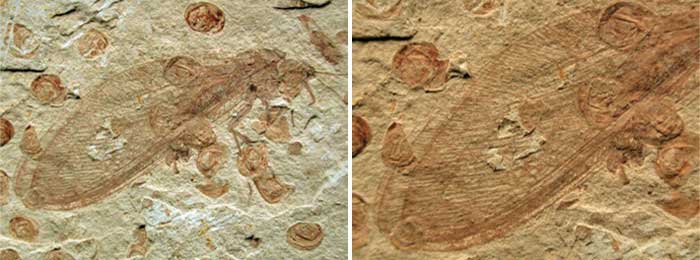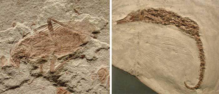 Hier ein Beispiel der Gattung Orpthoptera (Grashüpfer und verwandte Arten) aus der Familie der Haglidae, das an die heutigen Laubheuschrecken erinnert, gefunden in Hebei, China. Die anatomischen Details einschließlich der Farben dieses 125 Millionen Jahre alten Exemplars sind sehr gut erhalten. An der 27 mm langen Eier-Ablegeröhre, mit der es seine Eier im Erdboden vergrub ist erkennbar, daß es sich um Weibchen handelt. Es weist genau dieselben anatomischen Merkmale auf, wie heutige Laubheuschrecken.