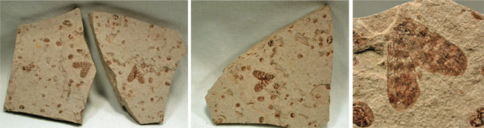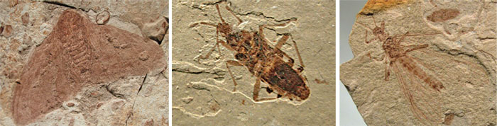 Ein Schmetterling (Lepidoptera) mit einer Flügelspannweite von über 5 cm aus der frühen Kreidezeit (vor etwa 125 Millionen Jahren) | Eine 18 mm große Steinfliege aus der frühen Kreidezeit (vor etwa 125 Millionen Jahren) | Eine 16 mm große Steinfliege aus der frühen Kreidezeit (vor etwa 125 Millionen Jahren) |