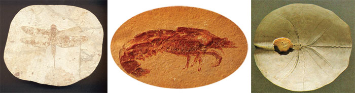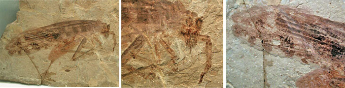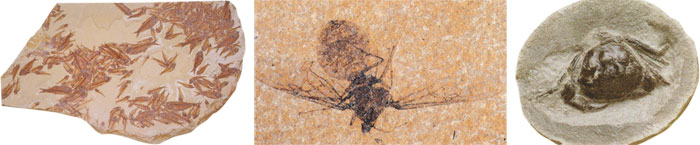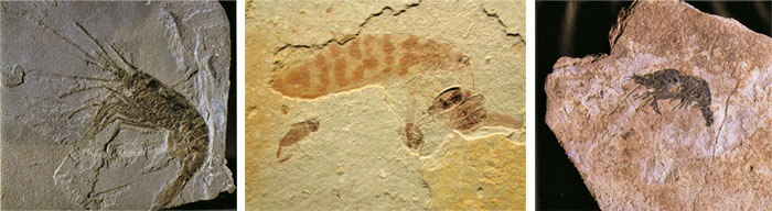 Ein 125 Millionen Jahre altes, verschiedene Insekten enthaltendes Fossil: Eine Fliege, mehrere Käfer und eine Mücke. | Ein Garnelen-Fossil, wie es häufig in Schichten des Jurazeitalters vorkommt. Dieses Fossil ist zwischen 140 und 200 Millionen Jahre alt und unterscheidet sich nicht von heutigen Garnelen. | Ein 250 – 270 Millionen Jahre altes Krabben-Fossil. Sein Aussenskelett besteht aus einer einzigen langen Schale, die den ganzen Körper bedeckt. Dieses 5 cm lange Krebstier findet sich überall in den heutigen Ozeanen. |