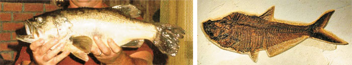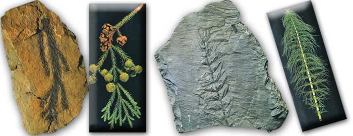 Günümüzde yaşayan Cryptomeniajaponica adlı ağaç, 300 milyon yıllık fosili ile tamamen benzerdir. (Solda başta) | Asterophyllites grandis 350 milyon yıllık bir bataklık bitkisi fosili ve günümüzdeki benzeri. |
