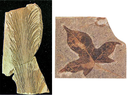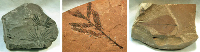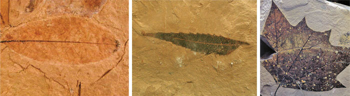 Die ersten noch heute lebenden Exemplare solcher 50 Millionen Jahre alten Rothölzer (Metasequoia) wurden in British Colombia in Kanada gefunden. Dieses Exemplar ist mit heute wachsenden Rothölzern identisch. | Diese Annularia stellata aus der Karbonzeit vor 330 Millionen Jahren wurde in Frankreich ausgegraben. Heute existierende Lebensformen dieser Pflanze werden Schachtelhalme genannt. | Dieses 50 Millionen Jahre alte Pappelblatt aus dem Eozän stammt aus Green River, Utah. |