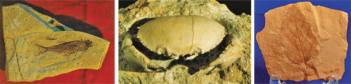 Dieses Fischfossil, gefunden nahe Beskonak in Ankara, Türkei, ist über 14 Millionen Jahre alt. | Diese Krabbenart, Harpactocarcinus, lebt vor 35 – 55 Millionen Jahren. Dieses Exemplar ist etwa 8 cm Lang. | Montana'da bulunan ve Paleosen devrinden (65-55 milyon yıl önce) kalma bu huş ağacı fosili üç boyutludur. |