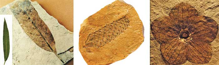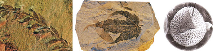 Ein Blütenpflanzen-Fossil (Archaefructus liaoningensis), eine der ältesten jemals gefundenen versteinerten Pflanzen. Das 130 Millionen Jahre alte Fossil weist die charakteristischen Eigenschaften aller Blütenpflanzen auf, einschließlich der weiblichen Fruchtknoten, die die Samen enthalten. Es unterscheidet sich nicht von heutigen Blütenpflanzen. | Dieses Fossil aus verschiedenen Platanen-Blättern wurde bei Kızılcahamam in Ankara gefunden und ist 18 Millionen Jahre alt. Sie haben dieselben Eigenschaften wie heutige Platanen-Blätter. | Mikroskopta yüksek ölçekte büyütülmüş polen fosili 146-65 milyon yıllık bu polen tanesi, bilinen en eski kapalıtohumlu polen türlerinden biridir. Bu polen, çeşitli bitkiler tarafından günümüzde de aynı şekliyle üretilmektedir. |