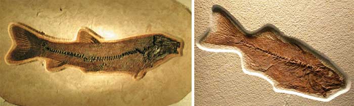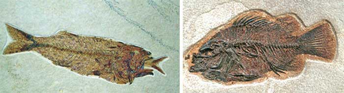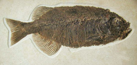 Dieser 50 Millionen Jahre alte Fisch fossilierte beim Verschlucken eines anderen Fisches, gefunden in der Green River Region im Bundesstaat Wyoming, USA. | Dieses 50 Millionen Jahre alte Fisch-Fossil der Gattung Priscacara aus dem Eozän stammt ebenfalls aus der Green River Gegend, wo etliche der bekanntesten Fischfossilien gefunden wurden. Auch bei anderen dort gefundenen Fossilien sind große Teile des Gewebes erhalten geblieben. |