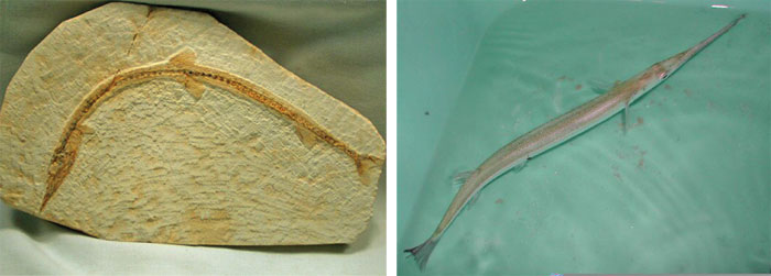 Dieser versteinerte Hornhecht wurde in der Gegend von Ramlia Taouz in Marokko gefunden. Mit einem Alter von 127 Millionen Jahren stammt er aus der Kreidezeit, und er ist mit heutigen Hornhechten identisch.