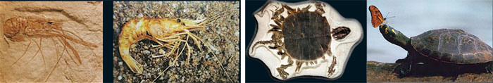 Es gibt keinen Unterschied zwischen diesem 195 Millionen Jahre alten Krabben-Fossil und heutigen Krabben. | Ein 50 Millionen Jahre altes Schildkröten-Fossil und eine heutige Schildkröte, deren Form sich seit Millionen Jahren nicht verändert hat. |