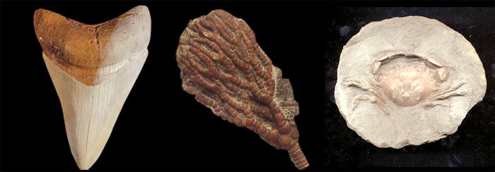 Ein 9 cm langer Haizahn, gefunden in einer Phosphatschicht in Zentralflorida. Dieses Fossil stammt aus der Zeit zwischen dem Eozän (vor 54 Millionen Jahren) und dem frühen Pliozän (vor 5 Millionen Jahren). | Ein Crinoiden-Fossil oft zu finden in Felsformationen des silurischen Zeitalters (vor 410 – 440 Millionen Jahren) und dem Mississippi-Zeitalter (vor 325 -360 Millionen Jahren). Es unterscheidet sich nicht von heutigen Crinoiden. | Ein weiteres Krabben-Fossil aus dem Oligozän (vor 23 -38 Millionen Jahren) |