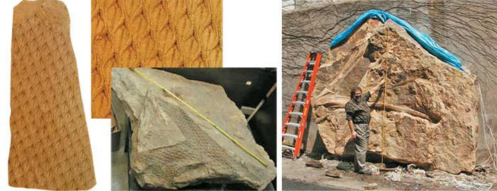 Lepidodendron ist eine Pflanze, die vor 270-345 Millionen Jahren wuchs. Die vergrößerte Ansicht des Fossils zeigt die Bruchstelle, an der es am Zweig angewachsen war, sehr deutlich. Man sieht sogar die Eintrittstellen der Wasserkapillaren in den Blattstengel in der Mitte der rautenförmigen Bruchstelle. Dieser Baum wächst noch heute in genau derselben Form.