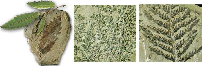 Quercus hispanica, Günümüzde meşe ağacının, yaklaşık 145 milyon yıl önce yaşamış olan bir cinsinin fosilidir. Günümüz meşe ağaçlarından farksızdır. | Eğrelti otu benzeri yaprakları olan Sphenopterid bitkisi kompleks yapılı bir bitkidir. Dış görünüş olarak günümüz bitkilerinden hiçbir farkı olmayan bu bitkinin fosilinde, yaprakları çok net görülmektedir. Resimdeki S. elegans türü, Karbonifer Dönemi'ndendir. (325-290 milyon yıl önce) | Tekrar tekrar bölünen bileşik yapraklardan oluşan bu bitki, Senftenbergia plumosa türüdür. Karbonifer Dönemi'ne (300 milyon yıl öncesine) ait bir bitkidir. |