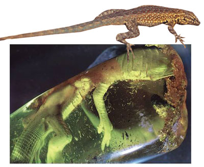 Ein 40 Millionen Jahre altes Eidechsen-Fossil in Bernstein. Sein Kopf, die Vorderbeinknochen, und stellenweise das Gewebe sind erhalten. Alle Merkmale dieser in Bernstein eingeschlossenen Eidechse sind mit denen heutiger Eidechsen identisch.