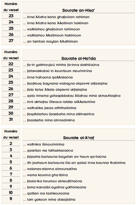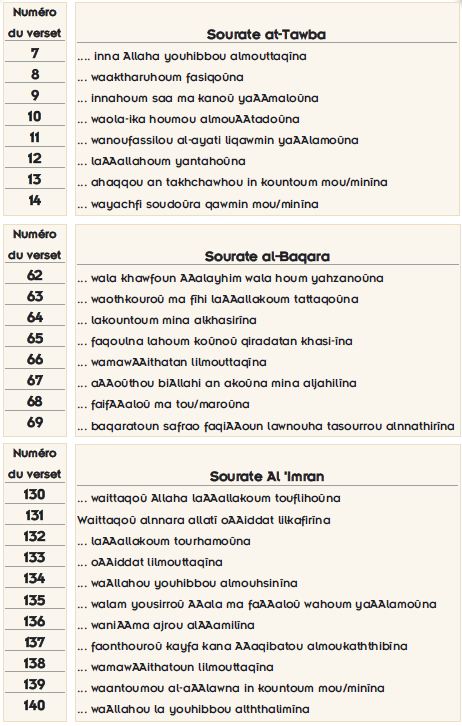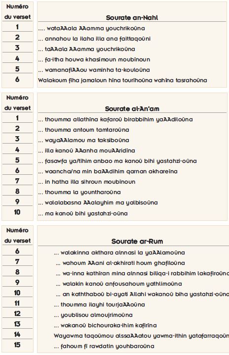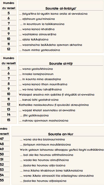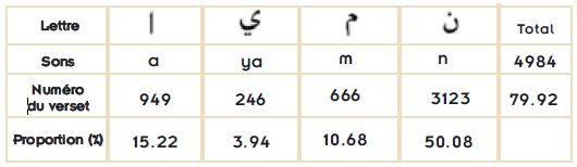 Lorsqu’un examen général de l’agencement des rimes dans le Coran est effectué, on se rend compte que 80% des rimes se composent de seulement trois sons (n, m, a) qui sont constituées des lettres "Alif, Mim, Ya et Noun".258