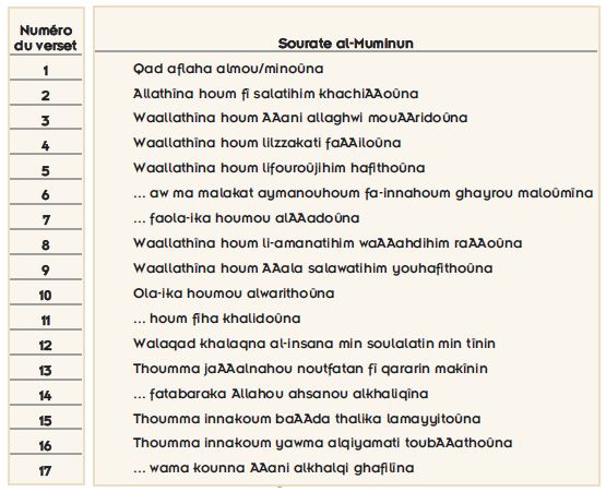 Lorsqu’on applique ces études à tout le Coran, on se rend compte que 50,08% du Livre sont rimés avec "Noun". En d’autres mots, la moitié des versets coraniques se terminent avec la lettre "Noun". Dans aucune œuvre littéraire d’une telle longueur, il n’a été possible de composer des rimes avec une seule intonation dans plus de la moitié du texte. Et ceci s’applique à toutes les langues et pas seulement à la langue arabe.