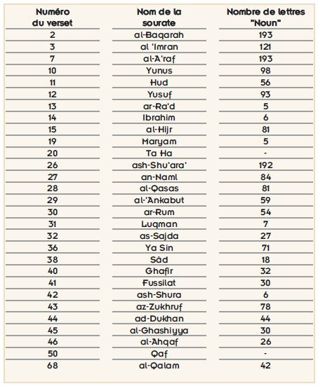 Le tableau ci-dessus montre la répartition des versets se terminant avec la lettre "Noun" dans les sourates commençant avec les lettres initiales (symboliques) . |