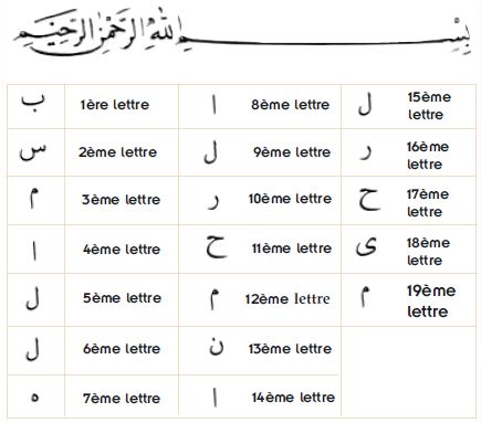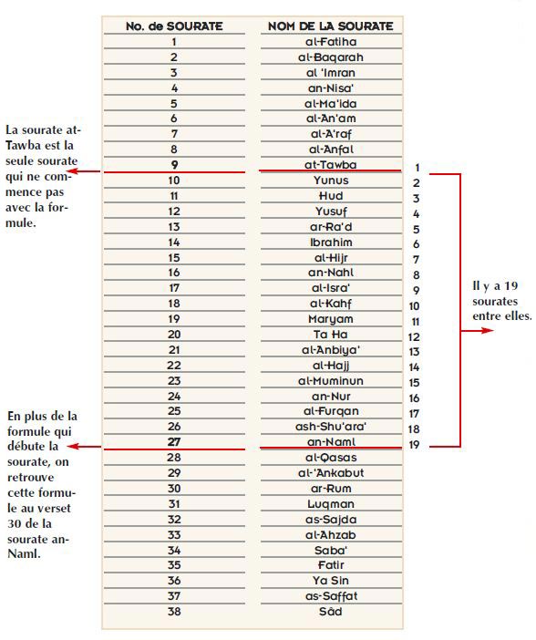 Sur les 114 sourates du Coran, seules 113 sourates commencent avec cette formule (Bismillah). La seule ne débutant pas avec la formule est la sourate at-Tawba. De plus, la sourate an-Naml est la seule sourate à contenir deux fois la formule. La première se situe au début et la seconde au verset 30. A partir de la sourate at-Tawba, qui ne commence pas avec la formule, la sourate an-Naml se trouve à 19 sourates plus loin.