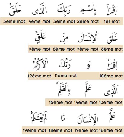 La 96ème sourate, la première à avoir été révélée, est la 19ème à partir de la fin. Elle consiste en 19 versets et contient un total de 285 lettres (19 x 5). Les cinq premiers versets de la révélation contiennent 76 lettres (19 x 4).