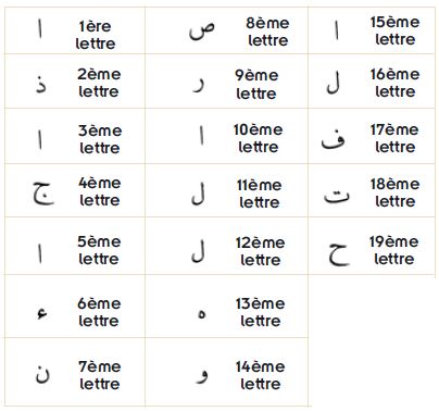 De plus, le premier verset de la sourate an-Nasr, qui parle de l’aide qui viendra de Dieu, contient 19 lettres.