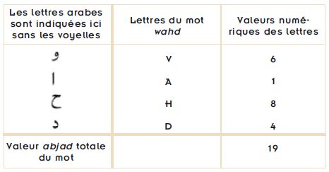 La valeur abjad du mot wahd, signifiant "un(e)" est de 19. Ce mot est utilisé avec différents autres mots dans le Coran, par exemple une porte, une variété de nourriture. Il est utilisé 19 fois avec le nom "Dieu".
