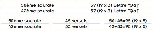 La 50ème sourate commençant avec la lettre "Qaf", contient un total de 57 (19 x 3) lettres "Qaf". De même, 57 lettres "Qaf" existent dans la 42ème sourate laquelle commence avec la lettre "Qaf". La 50ème sourate contient un total de 45 versets. Additionnés, ils totalisent 95 (19 x 5). Il existe 53 versets dans la 42ème sourate. Ceux-là totalisent encore une fois 95 (42 + 53).