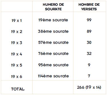 Lorsqu’on additionne ensemble le nombre de versets (en y incluant la formule) dans les sourates, dont le nombre est un multiple de 19, le résultat est remarquable :