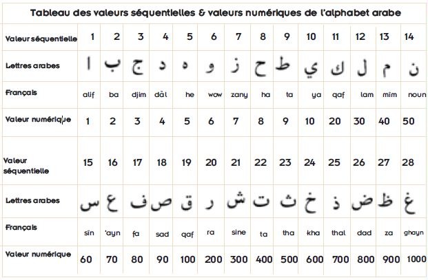 Chaque lettre de l’alphabet arabe a une valeur numérique. En d’autres mots, en arabe chaque lettre correspond à un chiffre. Un certain nombre de calculs peut être fait en partant de ce postulat. On les appelle calculs (abjad) numérologiques ou hisaab al-joummal.253 Les musulmans ont tiré avantage de ce principe de correspondance entre lettre et chiffre pour l’appliquer dans des domaines variés. Ilm al-jafr est l’un de ces domaines.