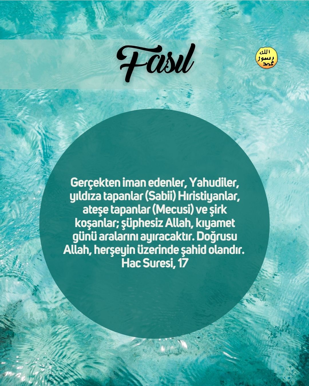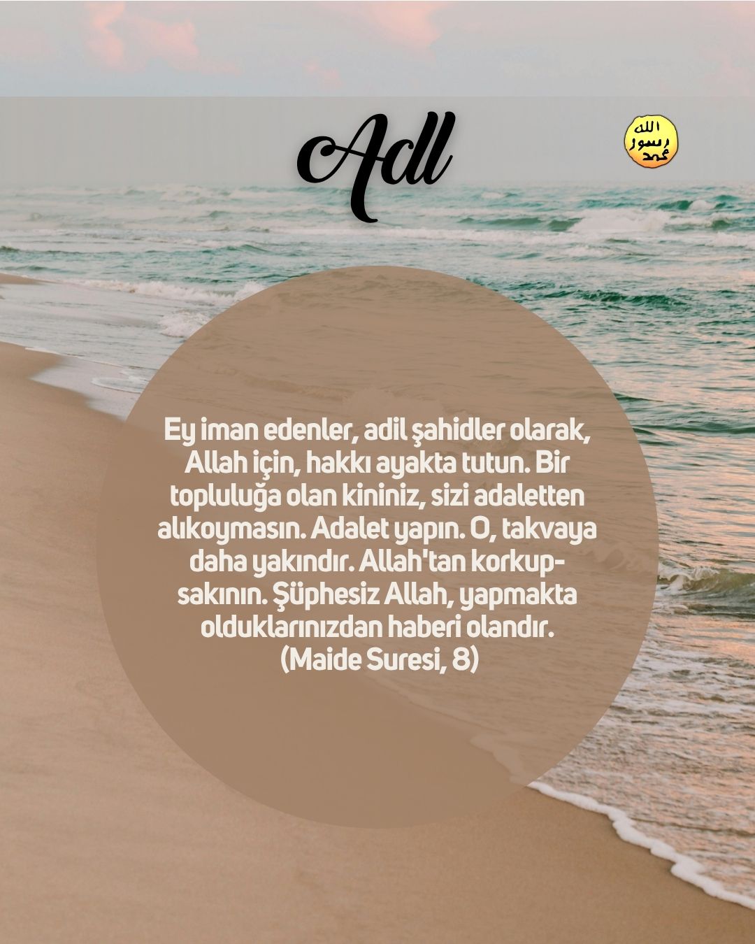 Ey iman edenler, adil şahidler olarak, Allah için, hakkı ayakta tutun. Bir topluluğa olan kininiz, sizi adaletten alıkoymasın. Adalet yapın. O, takvaya daha yakındır. Allah'tan korkup-sakının. Şüphesiz Allah, yapmakta olduklarınızdan haberi olandır. (Maide Suresi, 8)