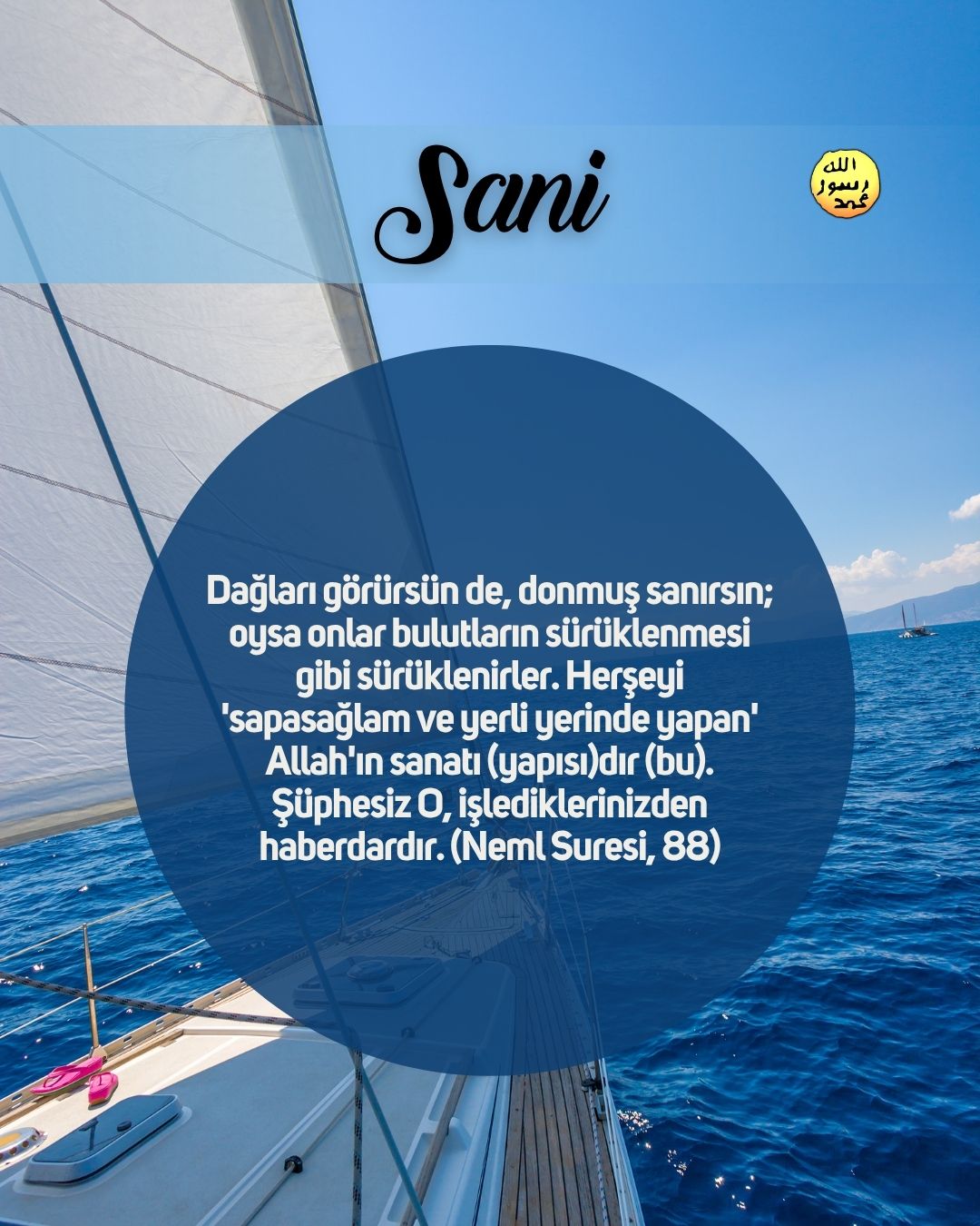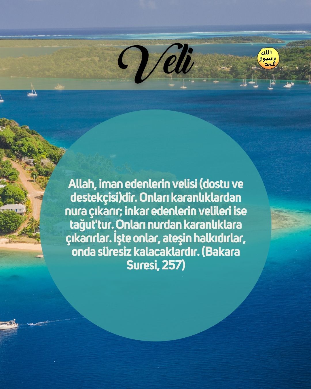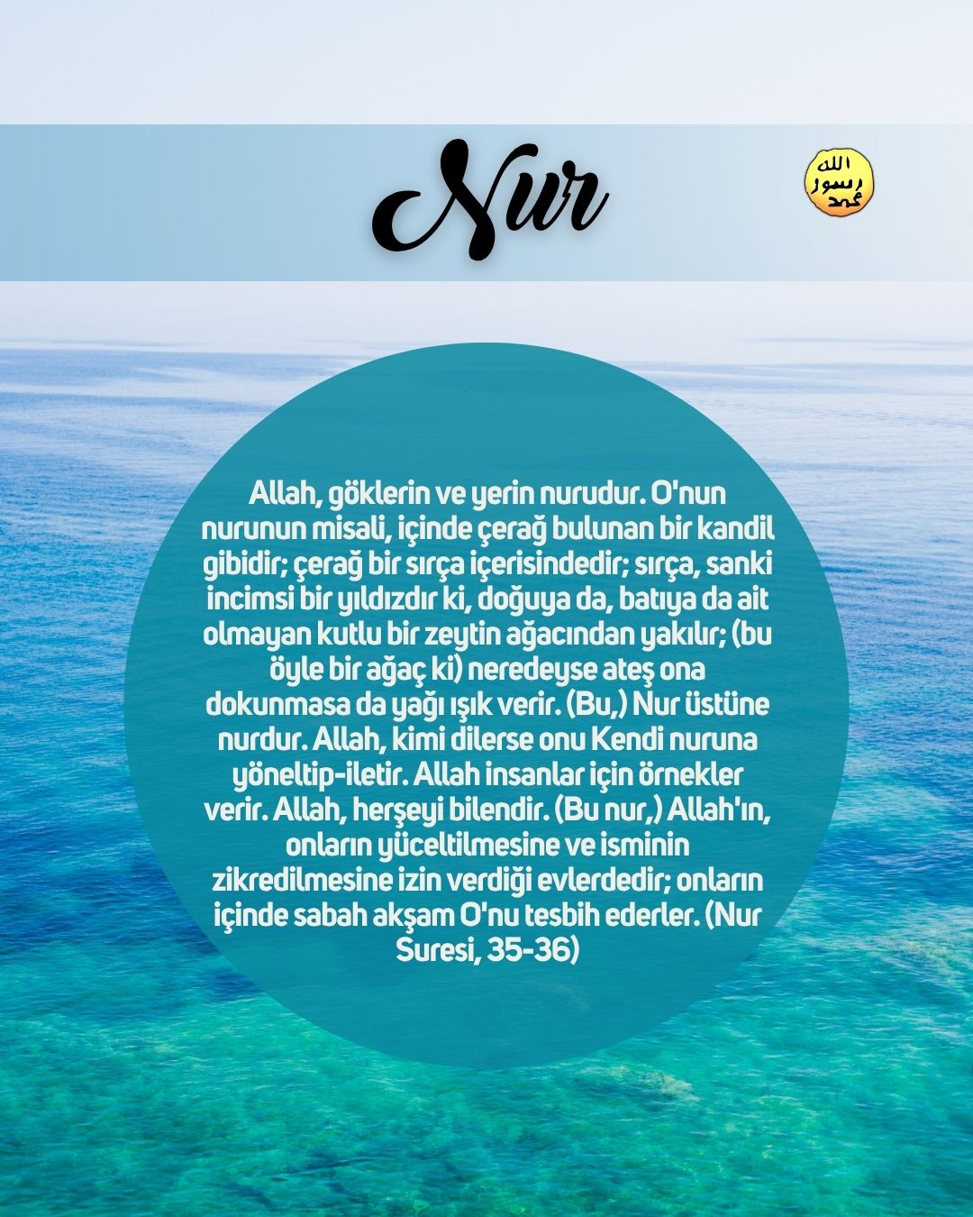 Nur Allah, göklerin ve yerin nurudur. O'nun nurunun misali, içinde çerağ bulunan bir kandil gibidir; çerağ bir sırça içerisindedir; sırça, sanki incimsi bir yıldızdır ki, doğuya da, batıya da ait olmayan kutlu bir zeytin ağacından yakılır; (bu öyle bir ağaç ki) neredeyse ateş ona dokunmasa da yağı ışık verir. (Bu,) Nur üstüne nurdur. Allah, kimi dilerse onu Kendi nuruna yöneltip-iletir. Allah insanlar için örnekler verir. Allah, herşeyi bilendir. (Bu nur,) Allah'ın, onların yüceltilmesine ve isminin zikredilmesine izin verdiği evlerdedir; onların içinde sabah akşam O'nu tesbih ederler. (Nur Suresi, 35-36)