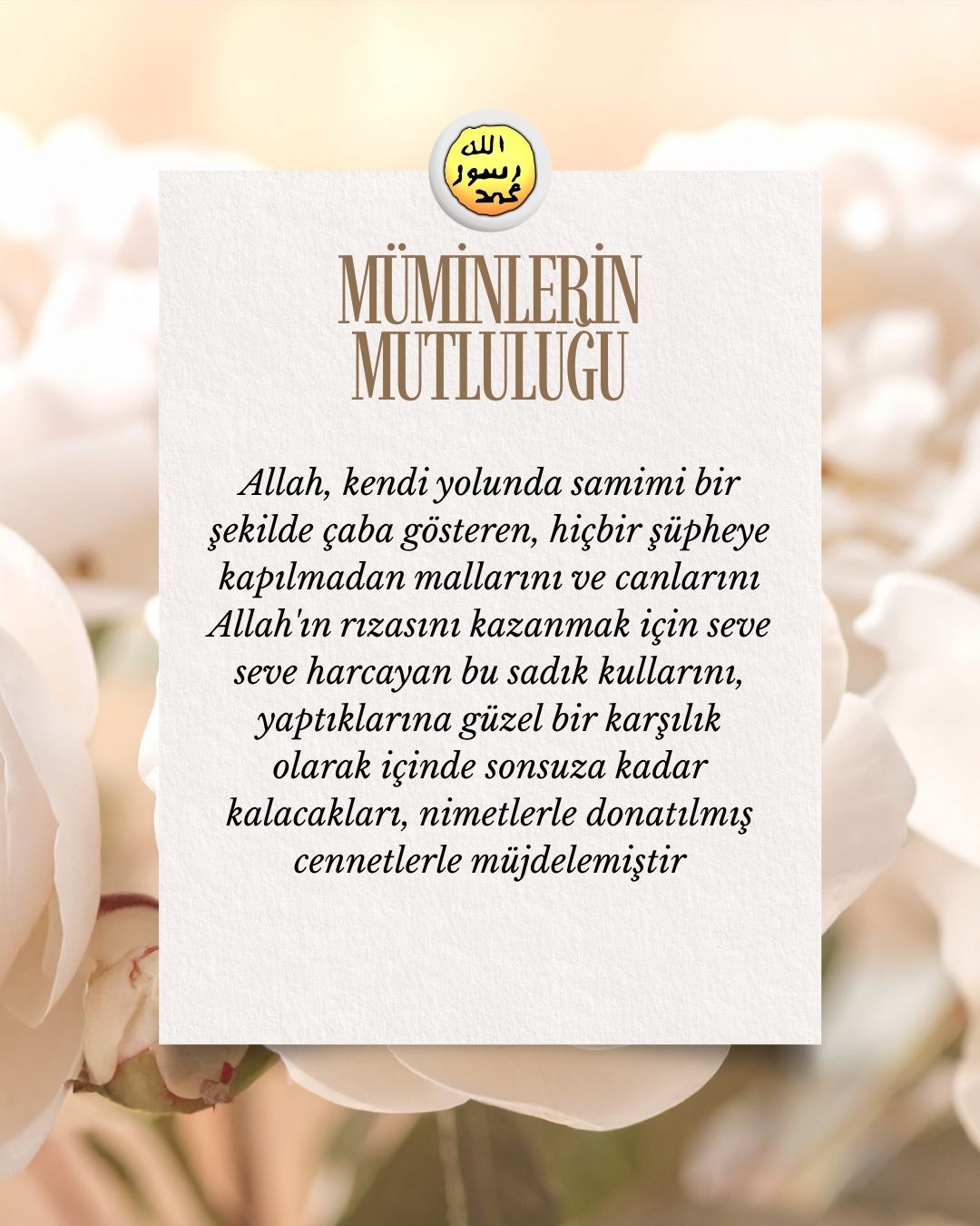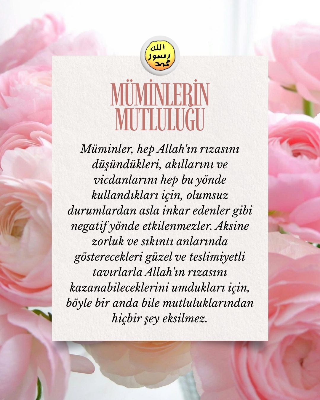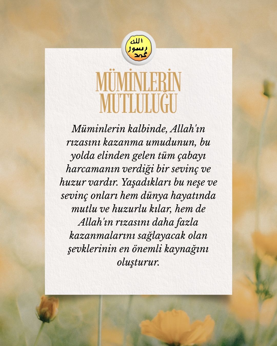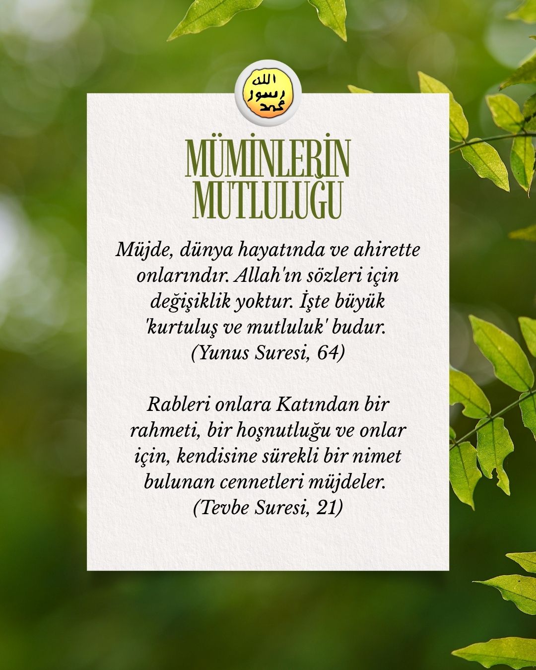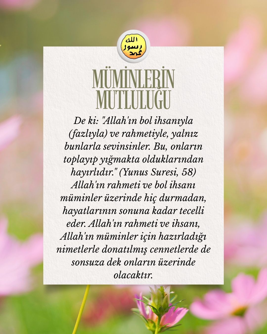 Müminlerin MutluluğuDe ki: "Allah'ın bol ihsanıyla (fazlıyla) ve rahmetiyle, yalnız bunlarla sevinsinler. Bu, onların toplayıp yığmakta olduklarından hayırlıdır." (Yunus Suresi, 58)