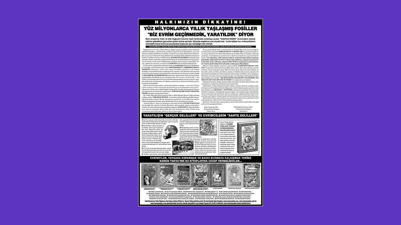 “Darwinizm tehlikesi mi var?” diyorlar. Bir profesör çıksın bakalım “yok” desin neler oluyor. “DÜNYA ÜNİVERSİTELERİNİN HİÇBİRİNDE DARWİNİZM GEÇERSİZDİR” DENEMİYOR. HİÇBİR ÜLKEDE. Hiçbir devlet görevlisi “ben Darwinizm’e karşıyım” diyemiyor. Madem Darwinizm yokmuş bunlar ne o zaman? Fas, Tunus, Cezayır gibi İslam ülkelerinde bile bütün devlet yapısı Darwinizm üzerine kurulu. Mısır’da muazzam baskı altında halk. Bütün hükümet Darwinizm’i savunuyor. Diğer ülkelerde de öyle. Dar bakıyorlar. Bir kısmının imanları zayıf, Allah’ın yaratmış olabileceğine ihtimal veremiyorlar.