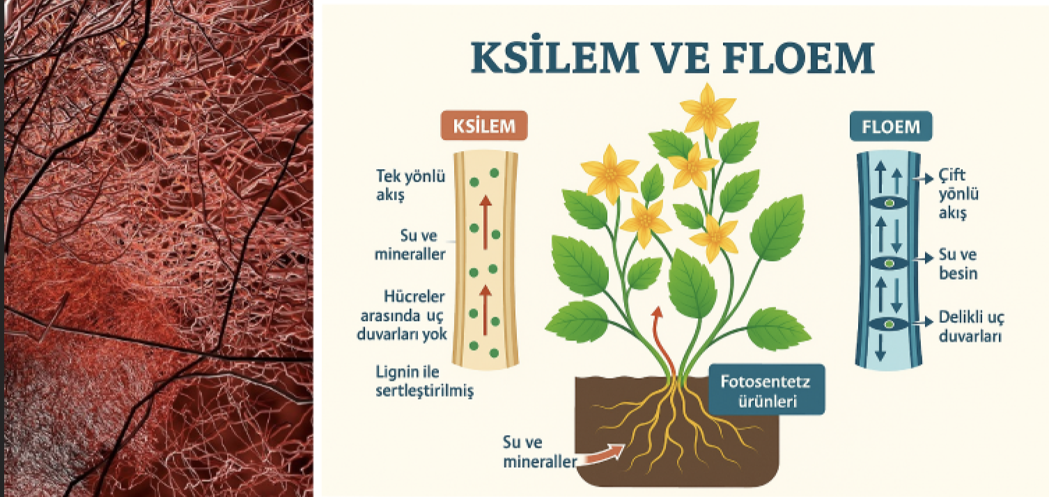 Floem → Yapraklardan diğer bölgelere ŞEKER VE BESİN taşır. (Hem yukarı hem aşağı)
