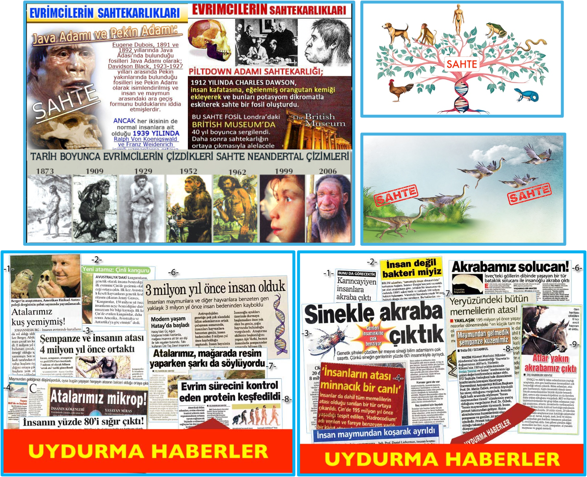 Basında sürekli evrimin ispat edildiğini telkin eden gerçek dışı haberler yapılır. İnandırıcılığı artırmak için, hayali konstrüksiyonlara dayanan sahte fosiller üretilip, gerçekmiş gibi müzelerde sergilenir.