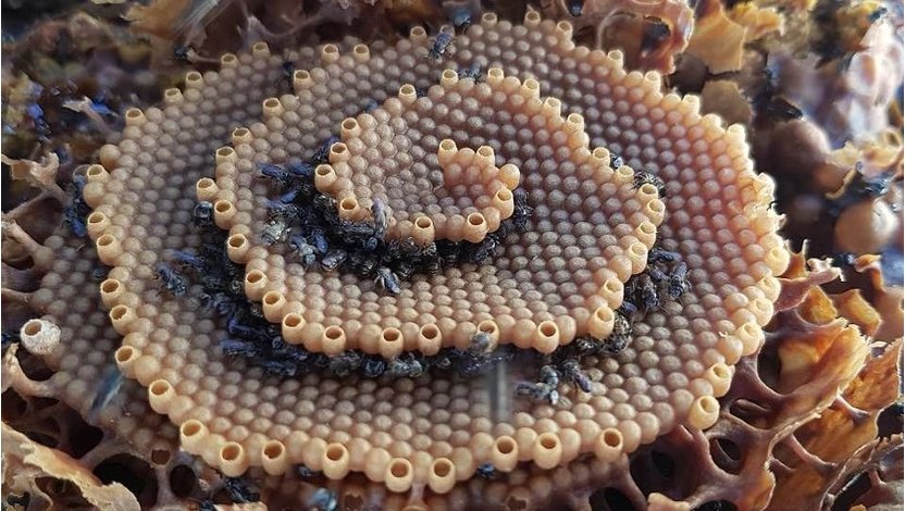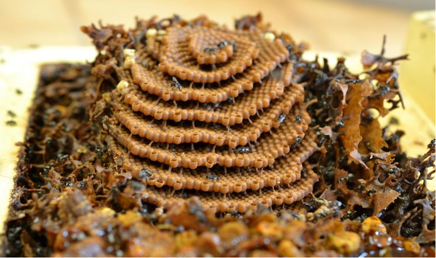 Tetragonula carbonaria, Avustralya’ya özgü iğnesiz bir bal arısı türüdür ve petek mimarisi, yaygın bal arısı (Apis mellifera) ile karşılaştırıldığında belirgin farklılıklar gösterir. Tetragonula carbonaria arıları peteklerini koni şeklindeki bir hacme sığacak biçimde inşa eder. Kovanda zeminde, geniş dairesel bir alanı kaplayan ilk petek katı bulunur. Onun üzerinde daha küçük başka bir kat, onun üstünde bir kat daha bulunur. Teras şeklindeki bu üst üste katların sayısı yirmiye kadar çıkabilmektedir (Heard, 2016).