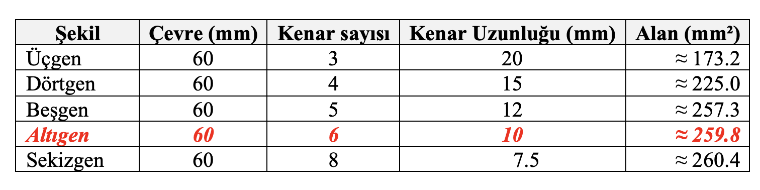 Bu tabloda eşit çevreli geometrik şekillerin alanları verilmiştir. Buradan, en az malzeme ile en geniş alana (dolayısıyla hacime) sahip olan hangi şekildir görmek mümkündür. Tablo incelendiğinde ilk anda çok küçük bir fark ile sekizgen şekli en iyi veriye sahip gibi görünebilir ancak bu fark çok küçüktür ve pratikte arılar için verimlilik+yapı kolaylığı+istiflenebilirlik açısından altıgen hâlâ en ideal şekildir. Sekizgenler düzlemde boşluksuz dizilemez; arada boşluklar kalır. Bu da petek yapımında israf ve yapısal zayıflık anlamına gelir. Sonuç olarak denebilir ki; matematiksel olarak sekizgen daha fazla alan sunsa da, altıgenin düzlemde boşluksuz dizilebilmesi, yapısal denge sağlaması ve inşa kolaylığı onu doğada en verimli seçim yapar. Arılar muhteşem bir planlama ile, var oldukları ilk andan itibaren sadece alanı değil, bütünsel verimliliği optimize eder (Hales, 2001).