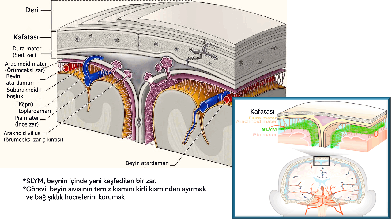 Rochester ve Kopenhag Üniversitelerinden bilim insanları, beyni çevreleyen yeni bir zar tabakası keşfettiler. Subaraknoidal Lenfatik Benzeri Zar (SLYM) olarak adlandırılan bu zarın, beynin korunmasında ve bağışıklık sisteminin işleyişinde önemli bir rol oynadığı belirlendi. Özetlemek gerekirse;