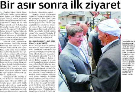 | Sancak'ın Karadağ'da kalan kısmının merkezi olan Rojaye'yi ziyaret eden Dışişleri Bakanı Davutoğlu yaklaşık bir asır sonra bölgeyi ziyaret eden ilk Dışişleri Bakanı oldu. Bakan, Boşnak Partisi lideri ve Devlet Bakanı Rafet Husoviç'in bir kardeşinin de Türkiye'de oturduğunu belirterek, "Ona dün de söyledim; sadece bir değil 70 milyon kardeşiniz var Türkiye'de." diye konuştu. Karadağ'da bir ofisi bulunan TİKA'nın da buradaki faaliyetlerini artırarak devam ettireceğini bildiren Davutoğlu, gerek eğitim, gerek sağlık, gerekse ekonomik ve sosyal alanda yapılacak faaliyetleri birer birer gözden geçirdiklerini, bunları bir takvim içinde nasıl gerçekleştirecekleri konusunda hep beraber çalışacaklarını söyledi. Davutoğlu, Rojayeli bir dostlarının Türkiye'ye Karadağ'ın büyükelçisi olarak atandığını da ifade ederek, "Dün kendisiyle de Podgorica'da görüştük. İnşallah böylece hem Türkiye-Karadağ ilişkileri en üst düzeyde ilerleyecek hem de Rojaye başta olmak üzere Karadağ'daki diğer Sancak şehirleri ile Türkiye arasında bir dostluk köprüsü olacak." diye konuştu. Bakan Davutoğlu, Rojaye'nin tarihini anlatan ve Osmanlı döneminden eserlerin de sergilendiği bir müzeyi de eşi Sare Davutoğlu ile birlikte gezdi. Davutoğlu, müze gezisi sırasında, son dinlendiği frekans olarak İstanbul'u gösteren, 1930'lardan kalma bir radyoyu da inceledi. |