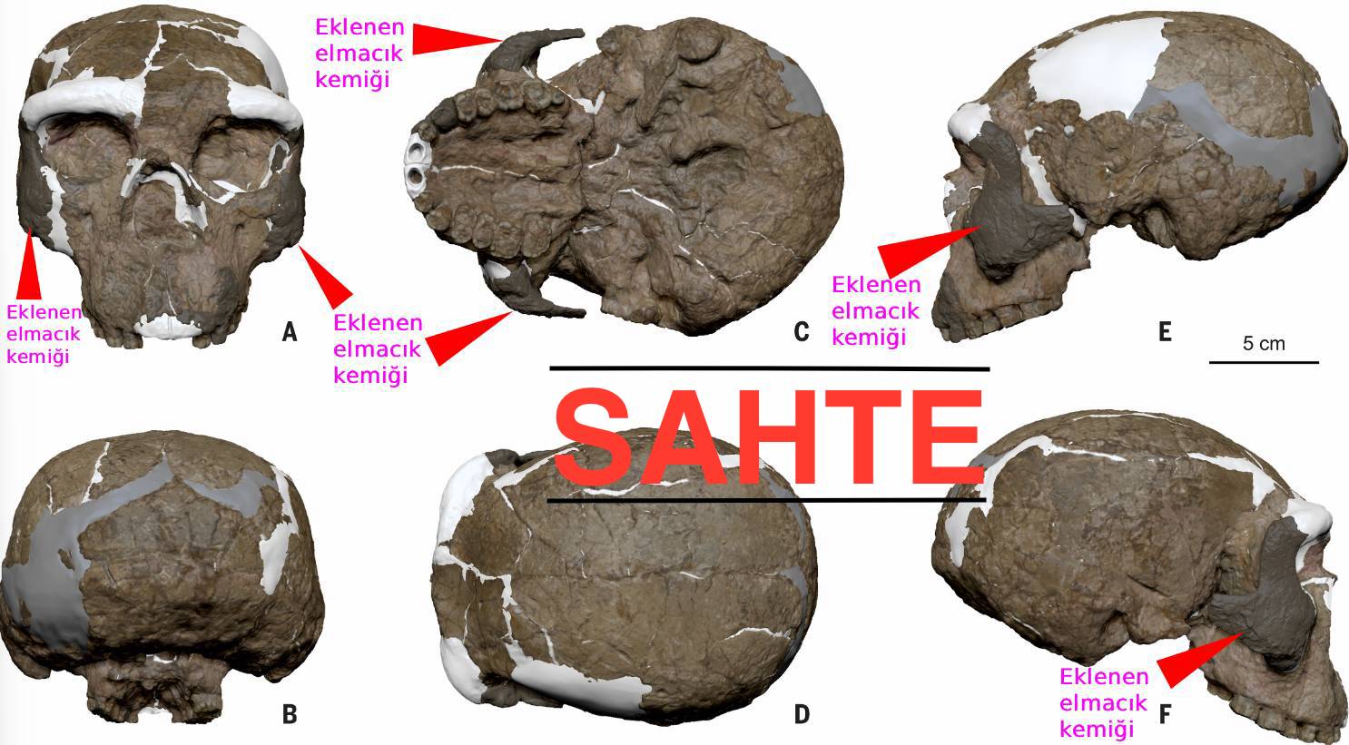 Bu veriler ışığında yıllardır aranan hayali “ara geçiş fosili” her zaman olduğu gibi atölyede üretilmiştir. Ezilmiş, parçalanmış ve eksik kafatasları, bilgisayar ortamında yeniden şekillendirilmiş, hiç var olmayan parçalar eklenmiş, eksik yerler hayalî biçimde tamamlanmış bu da bilimsel keşif gibi kamuoyuna sunulmuştur.