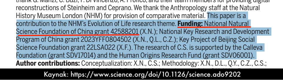 Bu doğrultu da Yunxian fosilleri üzerinde çalışma yapan Feng Xiaobo isimli araştırmacı ve ekibinin de yürüttüğü bu çalışma ve sonuçlar karşılığında pek çok Çin resmi kurumu ve özellikle Çin Devlet Kuruluşu olan “Ulusal Doğal Bilim Vakfı (NSFC) tarafından “Grant 42588201 (X.N.)” numarası ile fonlandıkları görülmektedir. (Aşağıda, Science Dergisi Makalesinden)