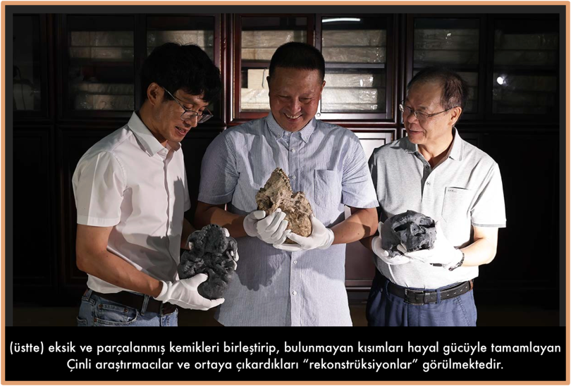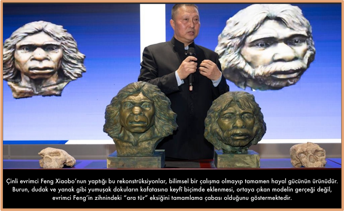 Bu doğrultuda, 35 yıl aradan sonra raflardan indirilerek tomografisi çekilen söz konusu kafatası parçaları, evrim fikrine dogmatik derecede takıntılı olması ile tanınan Çinli araştırmacı Feng Xiaobo ve ekibi tarafından “tahminlere dayalı” biçimde yeniden modellendi ve bilgisayar ortamında birleştirildi. Ancak “insana daha çok benzesin”diye zorlamalarla oluşturulan kafatasının “YÜZÜ DÜZ VE AŞAĞI DOĞRU UZUN” bir şekilde tasarlandı ve kafatası buna uygun olarak yeniden şekillendirildi.