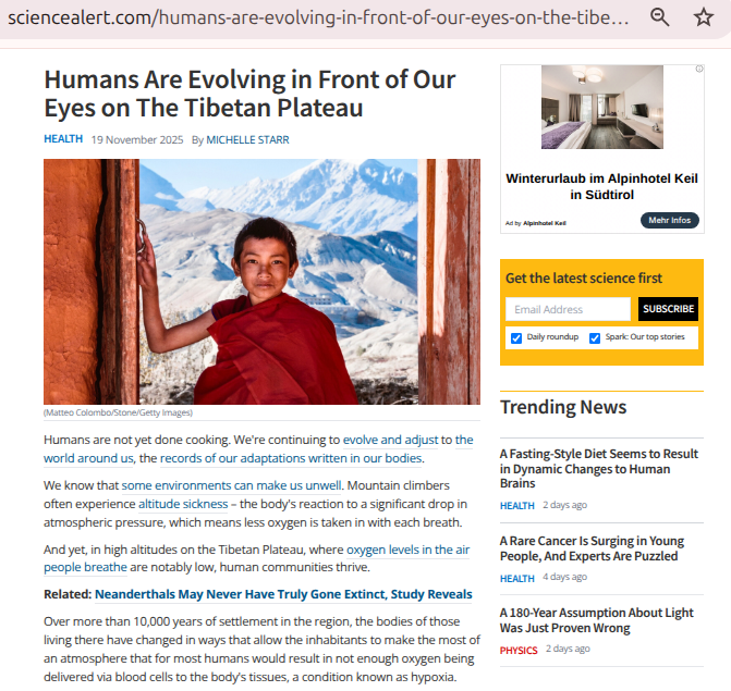 1) Michelle Starr, “Humans Are Evolving in Front of Our Eyes on The Tibetan Plateau”, ScienceAlert, 19 Kasım 2025, https://www.sciencealert.com/humans-are-evolving-in-front-of-our-eyes-on-the-tibetan-plateau