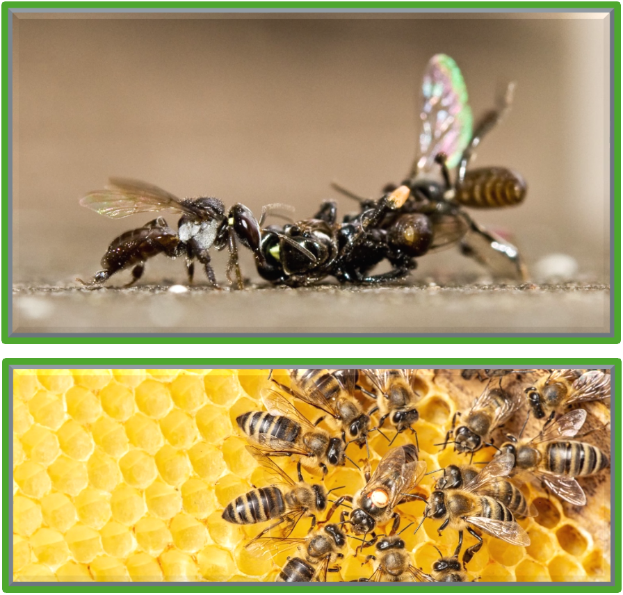 - Örneğin eşekarısı, arı kuşu veya başka kovan arılarının yağmalarına karşı normalden çok daha sert, hızlı ve agresif savunma yaparlar.