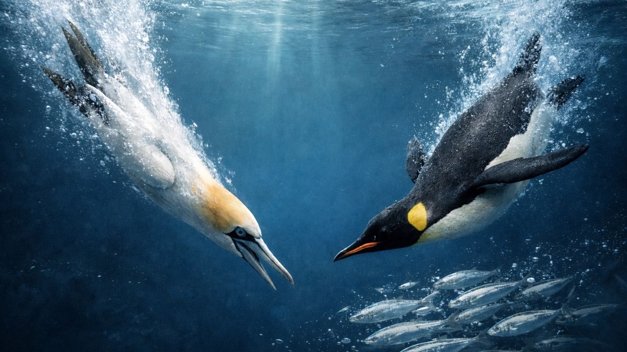 Yüzme bilen insanlar için yüksekten suya uygun şekilde giriş yapmak ya da suyun derinliklerine dalmak teknik bir beceri ve ciddi bir çaba gerektirir, ancak canlılar arasında bu eylemi hiç zorlanmadan hatta titiz mühendislik hesaplarıyla mükemmel şekilde gerçekleştiren neredeyse vücutları tam da bu konu için yaratılmış canlılar mevcuttur. Bu kuşlardan bir tanesi de türkçede sümsük kuşu olan bilinen Gannettir. Gannet havadan denize saatte 100 kilometreyi aşan büyük bir hızla dalarak hidrodinamik harikası sergileyen bir kuştur. Benzer şekilde karada yaşamaya uyumlu fizik yapıları ile bilinen penguenler de suyun altında yüzlerce metre derinliğe inerek çok yüksek basınç altında dakikalarca hayatta kalabilen eşsiz fizyolojik bir yapıya sahiptirler. Aşağıda detaylarını ile açıklayacağımız bu canlılar, dalış ve su altı fiziğinin sınırlarını zorlayan biyolojik açıdan mucizevi yaratılış örnekleridir.